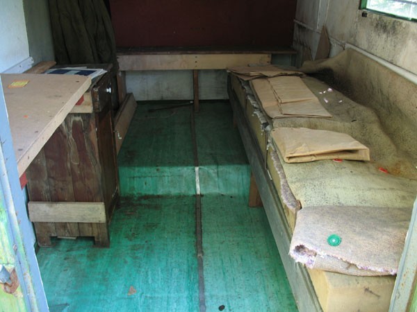 Dvě palandy, stolek, skříňka, na zemi linoleum. ©Kaja (2008)